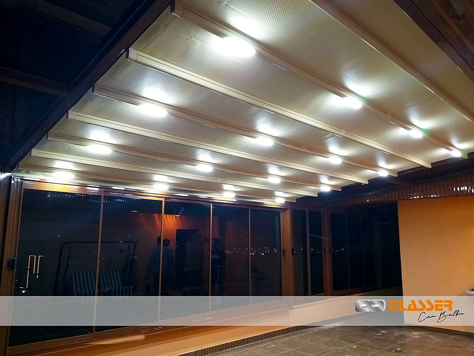 Yarı camlı teras kapatma uygulaması modern şık görünümü güneş ışığından ve enerjisinden dengeli faydalanılması gibi bir çok avantajları olan modern bir teras kapatma uygulamamızdır. Tamamı kapalı uygulamalar güneş ışığını kesip teras bölgesinin ışıksız kalmasına neden olup Tamamı camlı sistemler ise tam tersi aşırı güneş alarak mekanı aşırı sıcak tutup teras alanının kullanımını zorlaştırabilirler. Yarı camlı sistemlerde ise bu problemler ortadan kaldırılmış olup mekanın hem yazın hem kışın ideal ışık ve sıcaklık alarak konforlu kullanımını sağlamaktadır. Dış cepheden bakıldığında cam ağırlıklı görünüşü ile göze batmayan, komşuları rahatsız etmeyen şık ve modern bir görünümü vardır. Sistem çelik konstrüksiyon uygulanarak yapılıp kar yüküne rüzgara karşı dayanıklıdır Camlar temperli ve hafıf mavi renkte tercih edilip alüminyum contalı kapaklar ile montajı yapılır sağlam ve su gecirmez olup kar yüküne dolu yağmasına dış etkenlere karşı emniyetli dayanıklıdır . Teras uygulaması teras etrafına sürme cam , cam balkon , alüminyum ya da pvc doğrama takılmasına uygun yapılmaktadır Teras etrafına çekme oluk yapılıp yağmur gider boru bağlantıları yapılmaktadır Sisteme çatı çıkış penceresi uygulanabilir camsız tavan alanına pvc lambri ya da ahşap lambri renk seçenekleri ile isteğe bağlı uygulama yapılır