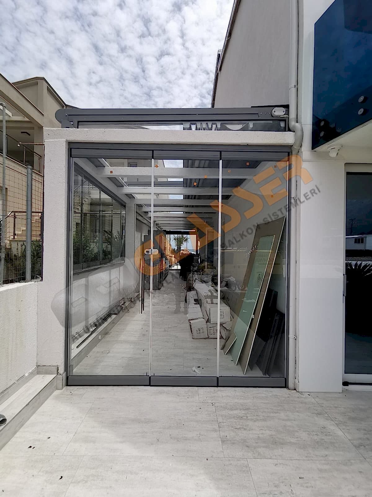 10 mm temperli camlar kullanılan bu sistemde her bir camın 4 köşesine belirlenen ölçülerde delikler açılarak derlin pimler bu delikler içerisine yerleştirilir. Alüminyum baza profilleri camın alnından sürülerek pimlerin bazadaki tırnaklara geçmesini sağlar. Cam ile bütünleşen baza profili üst ray kasaya her camı 4 adet rulman taşıyacak şekilde asılır.